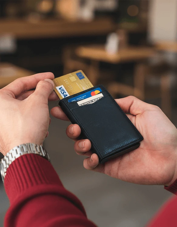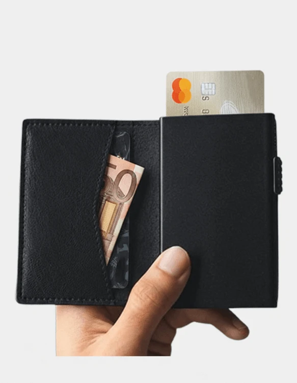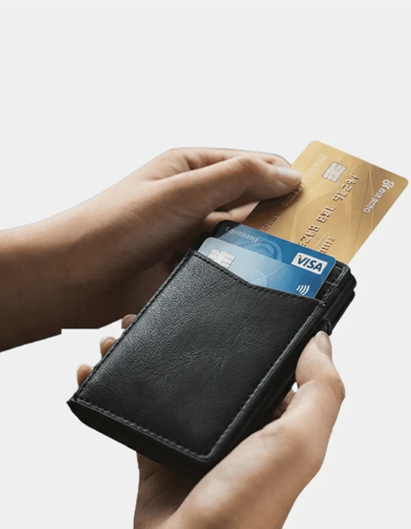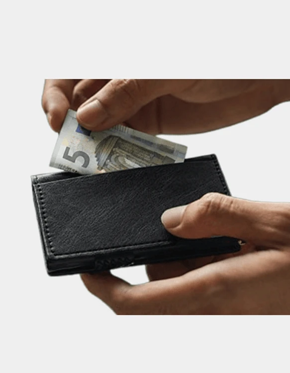 Elegantna moška denarnica v slim dizajnu, izdelana iz kakovostnega usnja, z izvlečnim mehanizmom za kartice in integrirano RFID zaščito za varno shranjevanje kartic in bankovcev.