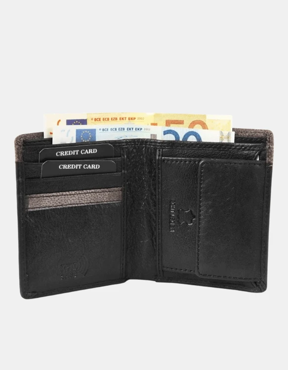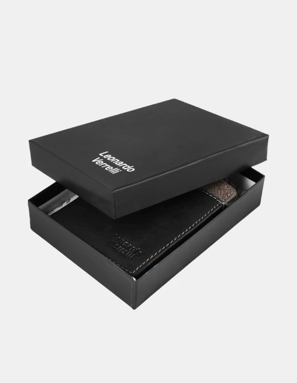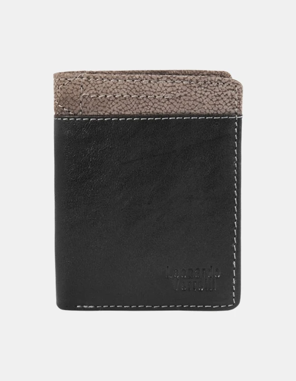 Leonardo Verrelli Blacksmith je moška denarnica, ki združuje klasičen značaj, trpežno izdelavo in sodobno funkcionalnost. Izdelana je iz kakovostnega pravega usnja v globoki črni barvi, dopolnjene s kontrastnim sivim robom, ki denarnici daje robusten, a prefinjen videz.
