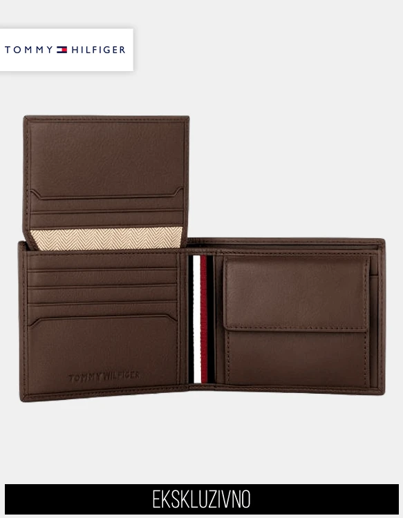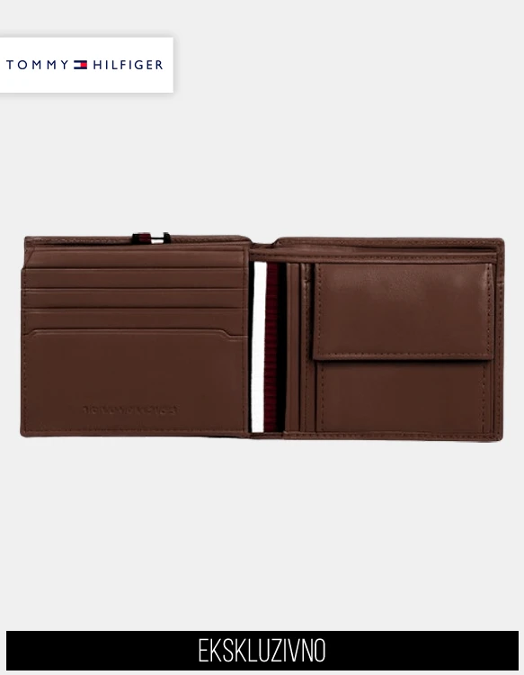 Notranjost denarnice razkriva premišljeno organizacijo, okrepljeno z dodatnim preklopnim (flip-up) delom, ki ponuja prostor za dokument ali dodatne kartice. Na voljo je več rež za kartice, praktičen žep za kovance z gumbom ter dva ločena predela za bankovce, ki omogočata jasen in urejen pregled nad gotovino. Značilni notranji detajl v barvah Tommy Hilfiger doda prepoznaven estetski podpis.